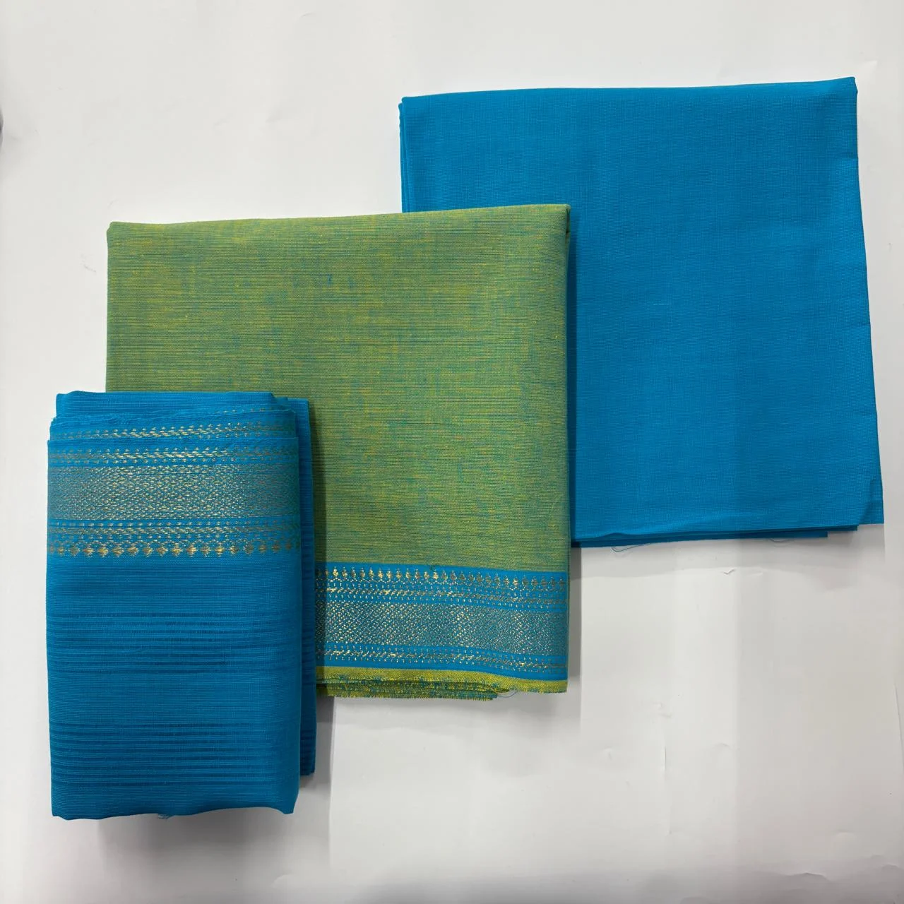 This traditional Mangalagiri cotton dress material combines vibrant intricate zari borders, making it suitable for daily wear, festive occasions, and office use. The lightweight fabric ensures day-long comfort while keeping your style graceful and classy.