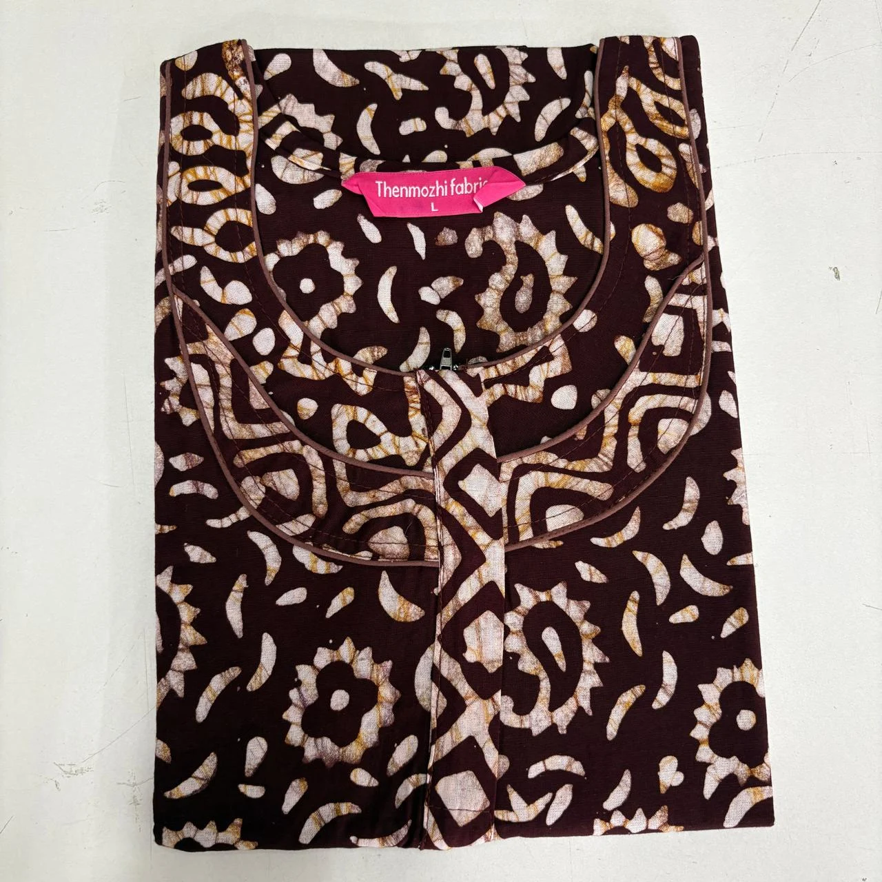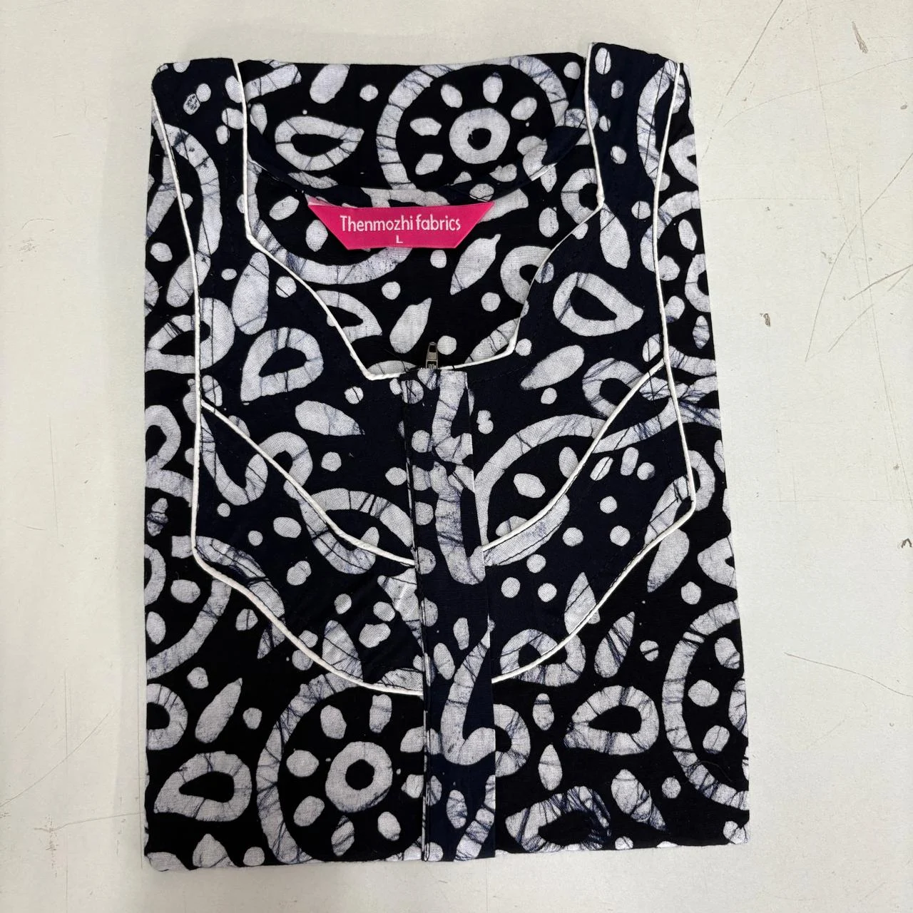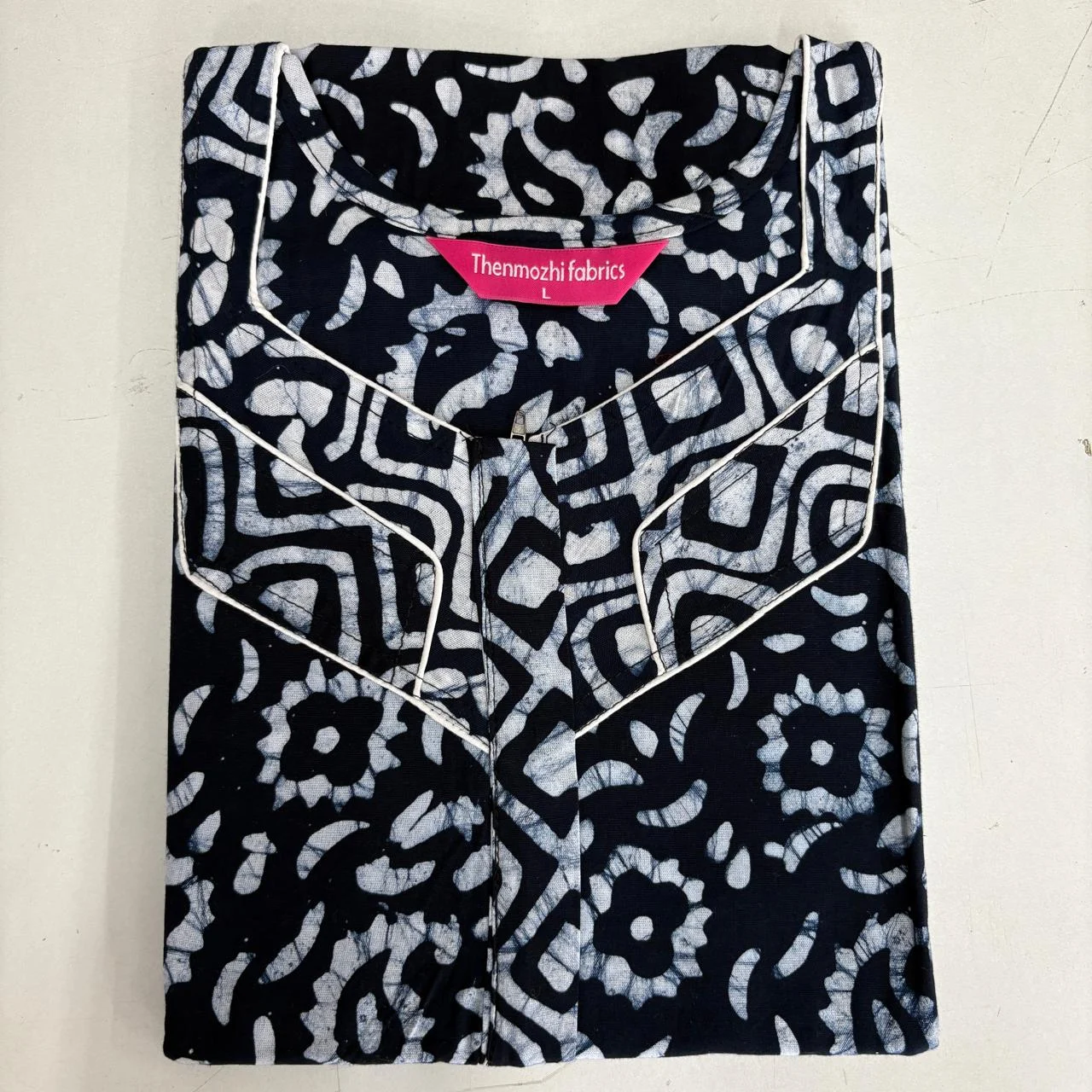 Experience comfort and style with our Batik Nighty (Size L) — handcrafted from 100% soft cotton with traditional batik prints. Designed with a front zipper, relaxed fit, and smooth piping finish. Perfect for everyday home wear, summer nights, and gifting. Available in 12 elegant printed designs by Thenmozhi Fabrics.