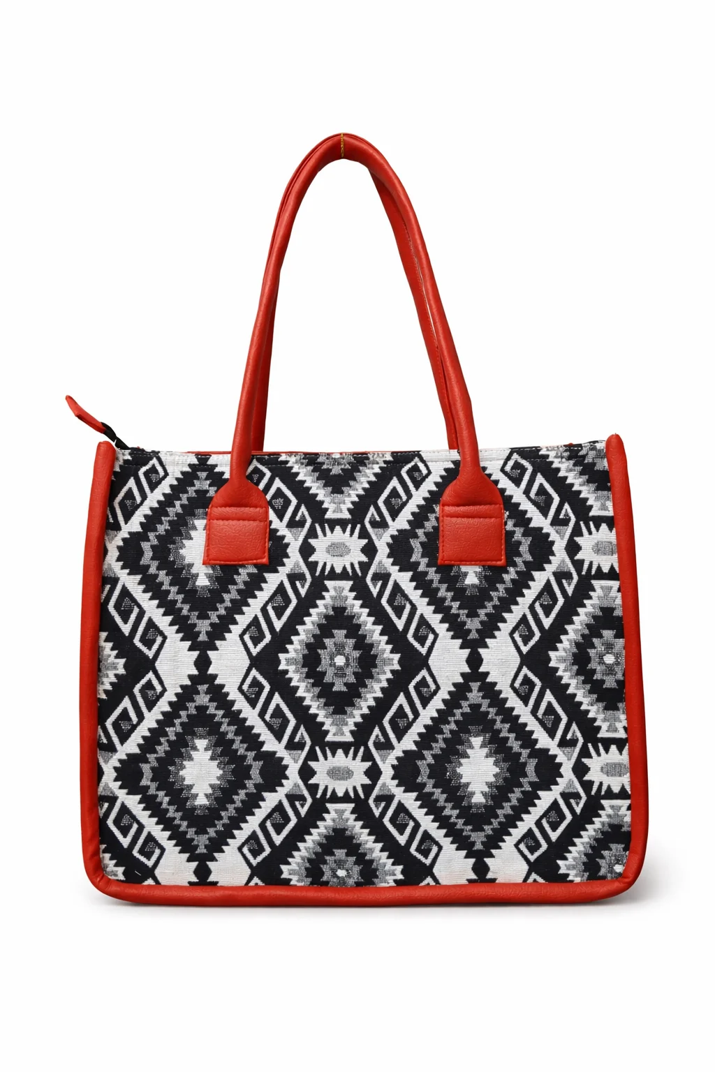 The 550 Rupees Laptop Hand Bag is crafted using handwoven patterned cotton fabric, finished with PU leather edging and metal hardware. Its structured frame keeps the bag upright, while the padded interior ensures device safety.