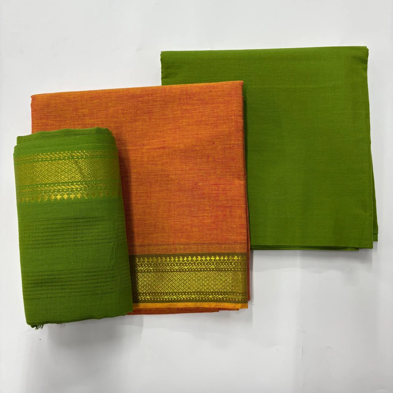 This traditional Mangalagiri cotton dress material combines vibrant intricate zari borders, making it suitable for daily wear, festive occasions, and office use. The lightweight fabric ensures day-long comfort while keeping your style graceful and classy.