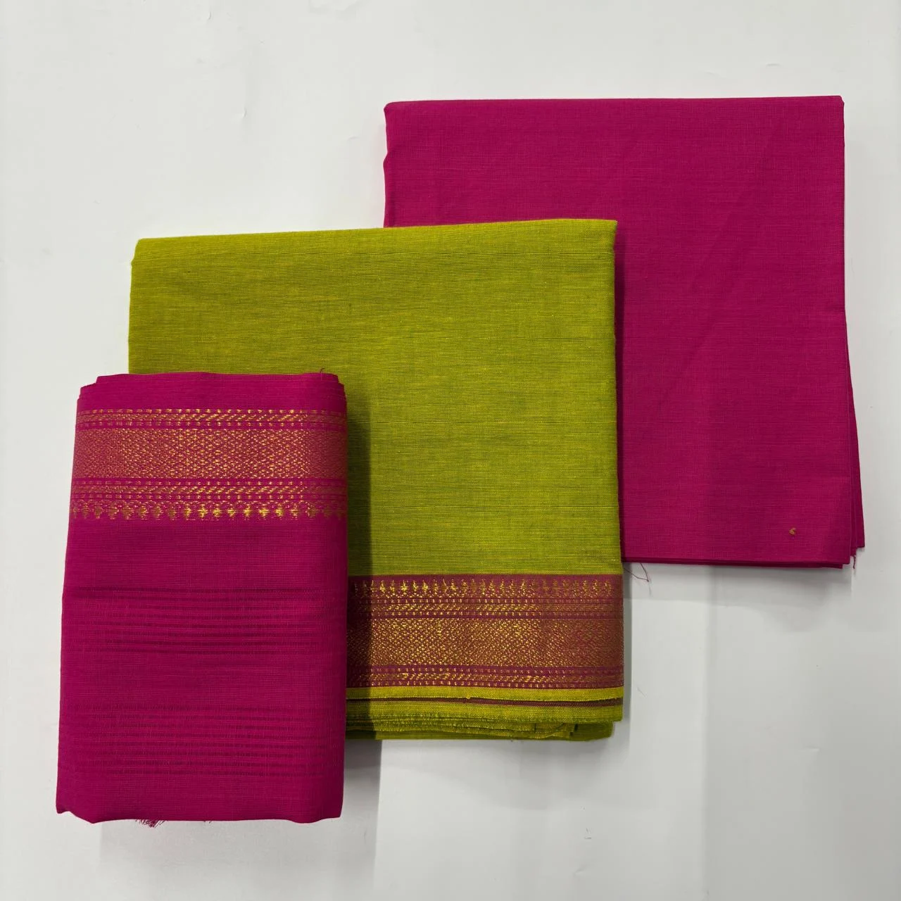 This traditional Mangalagiri cotton dress material combines vibrant intricate zari borders, making it suitable for daily wear, festive occasions, and office use. The lightweight fabric ensures day-long comfort while keeping your style graceful and classy.